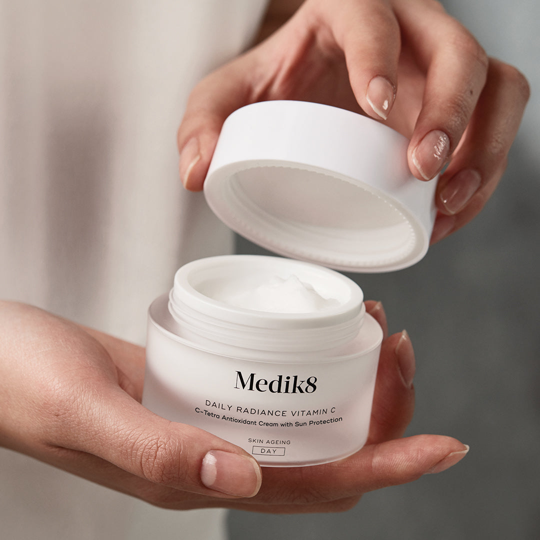 An all-in-one moisturiser and sunscreen that serves as the perfect introduction to vitamin C and Medik8’s anti-ageing philosophy. Daily Radiance Vitamin C combines powerful antioxidant protection with broad spectrum sun protection. The multifunctioning vitamin C cream restores radiance and deeply hydrates skin, leaving a brighter, smoother, more youthful-looking appearance. With a light, natural citrus scent, this nourishing moisturiser uplifts the senses, awakening skin as it provides that all-important sun protection, without any sticky after-feel.